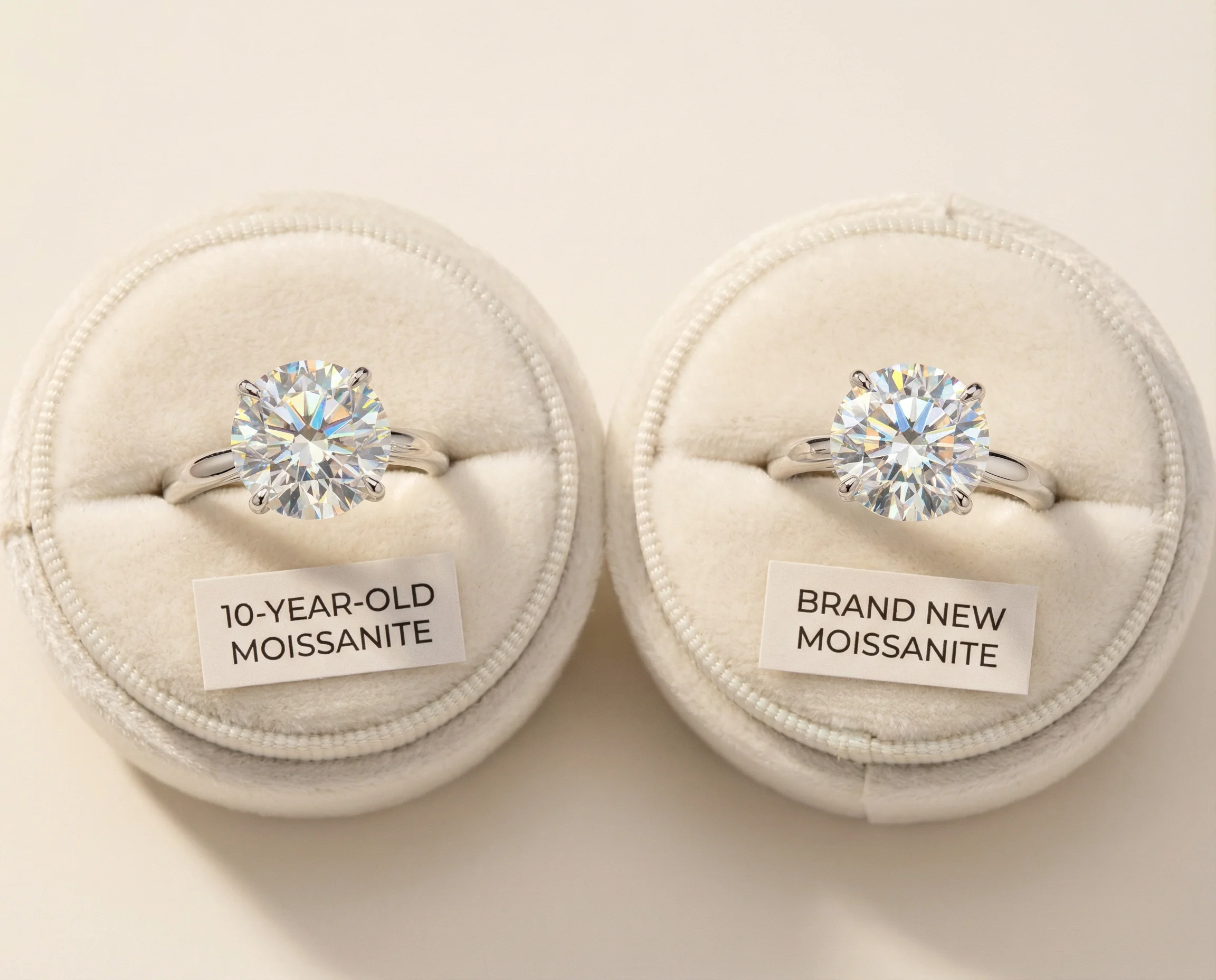 We've examined moissanite rings from the earliest commercial production (late 1990s) that are now approaching 30 years old. When professionally cleaned, these stones are indistinguishable from new moissanite. There's no cloudiness, no fading, no structural degradation.