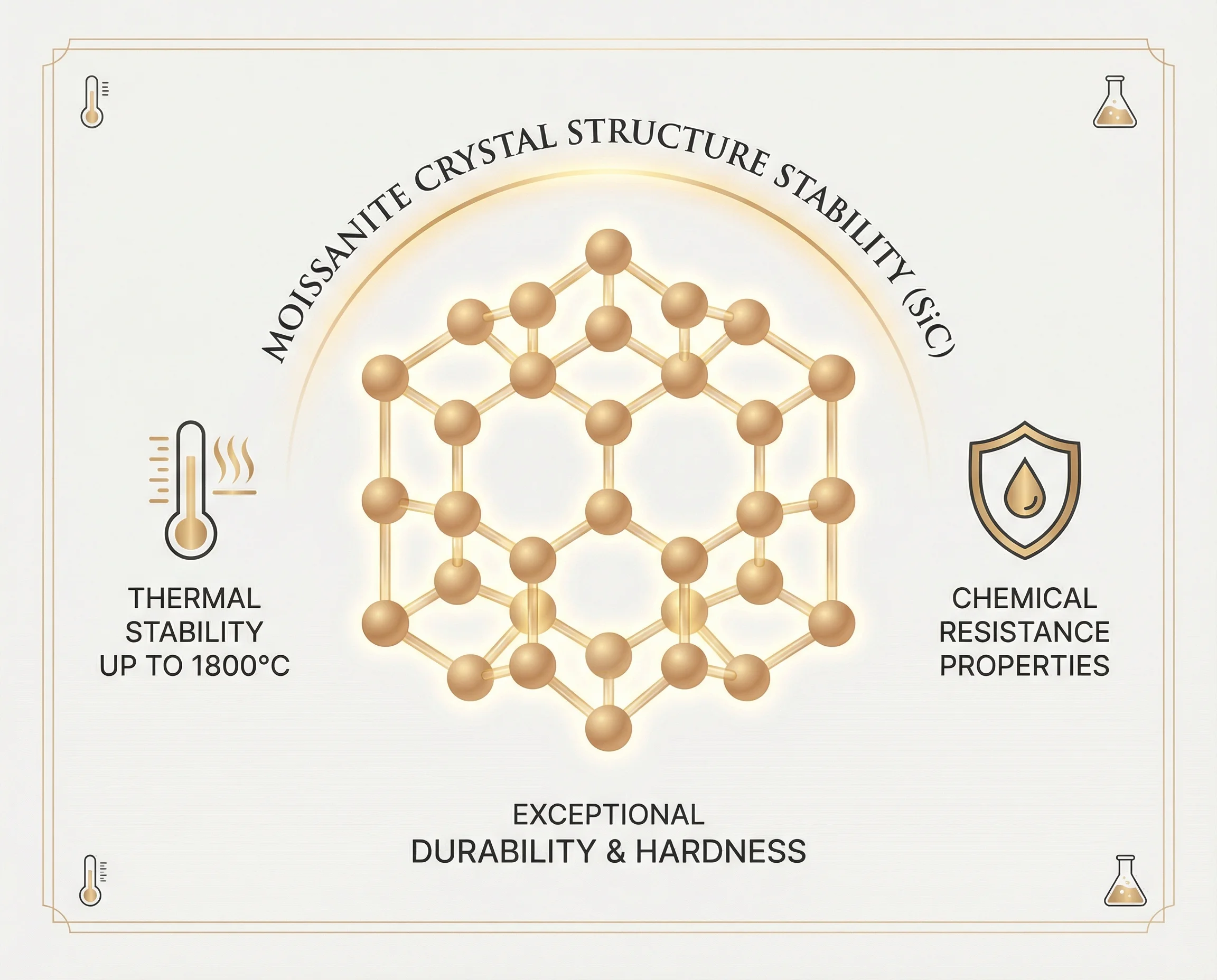 Moissanite is silicon carbide (SiC), one of the most chemically stable compounds on Earth. Its crystal structure is permanently locked in place and doesn't degrade from exposure to air, water, light, or typical chemicals. The same properties that make silicon carbide valuable in industrial applications—extreme hardness and chemical inertness—make moissanite an exceptional gemstone for lifelong wear.