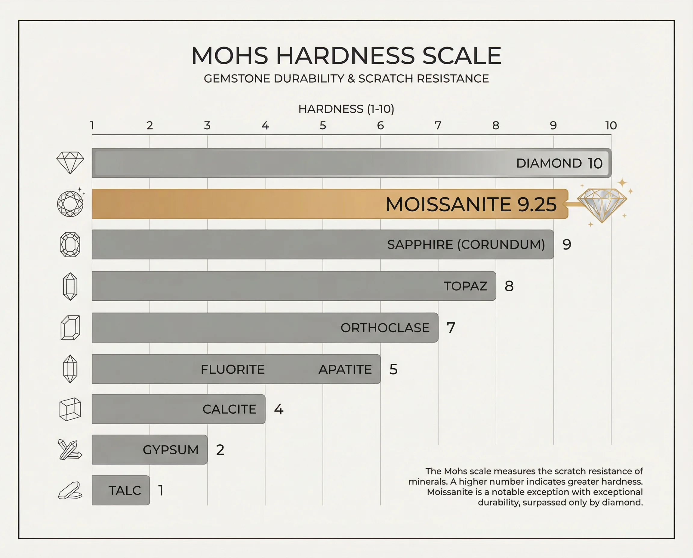 On the Mohs hardness scale (which measures scratch resistance), moissanite scores 9.25 out of 10. For context: