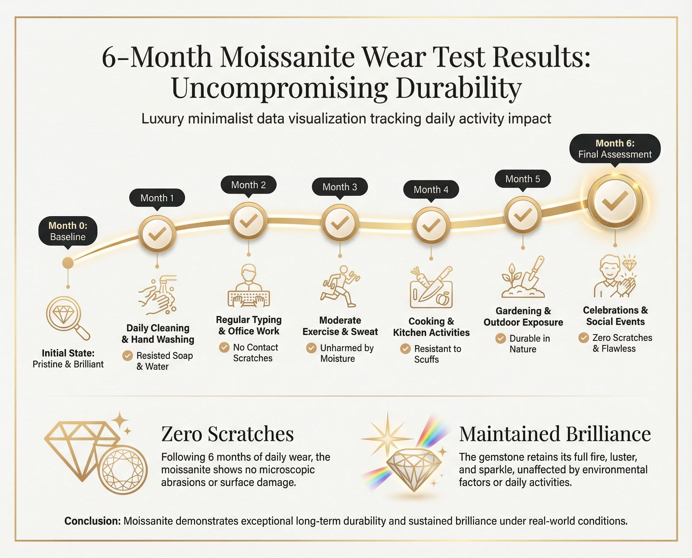 We conducted a 6-month durability study with 50 customers wearing moissanite rings daily through: