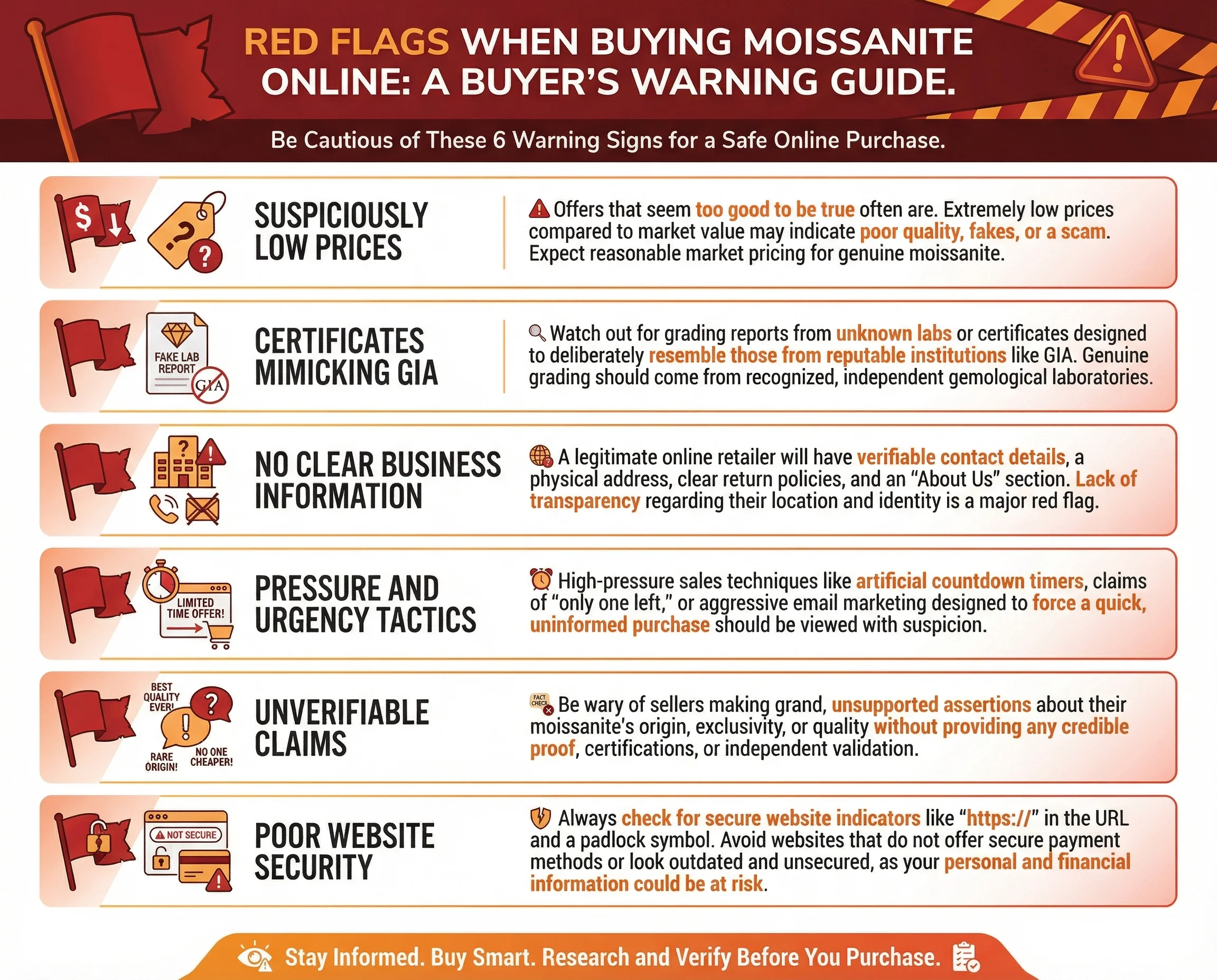 ✗ Suspiciously low prices: Quality moissanite has real costs. If it's dramatically cheaper than competitors, question why.