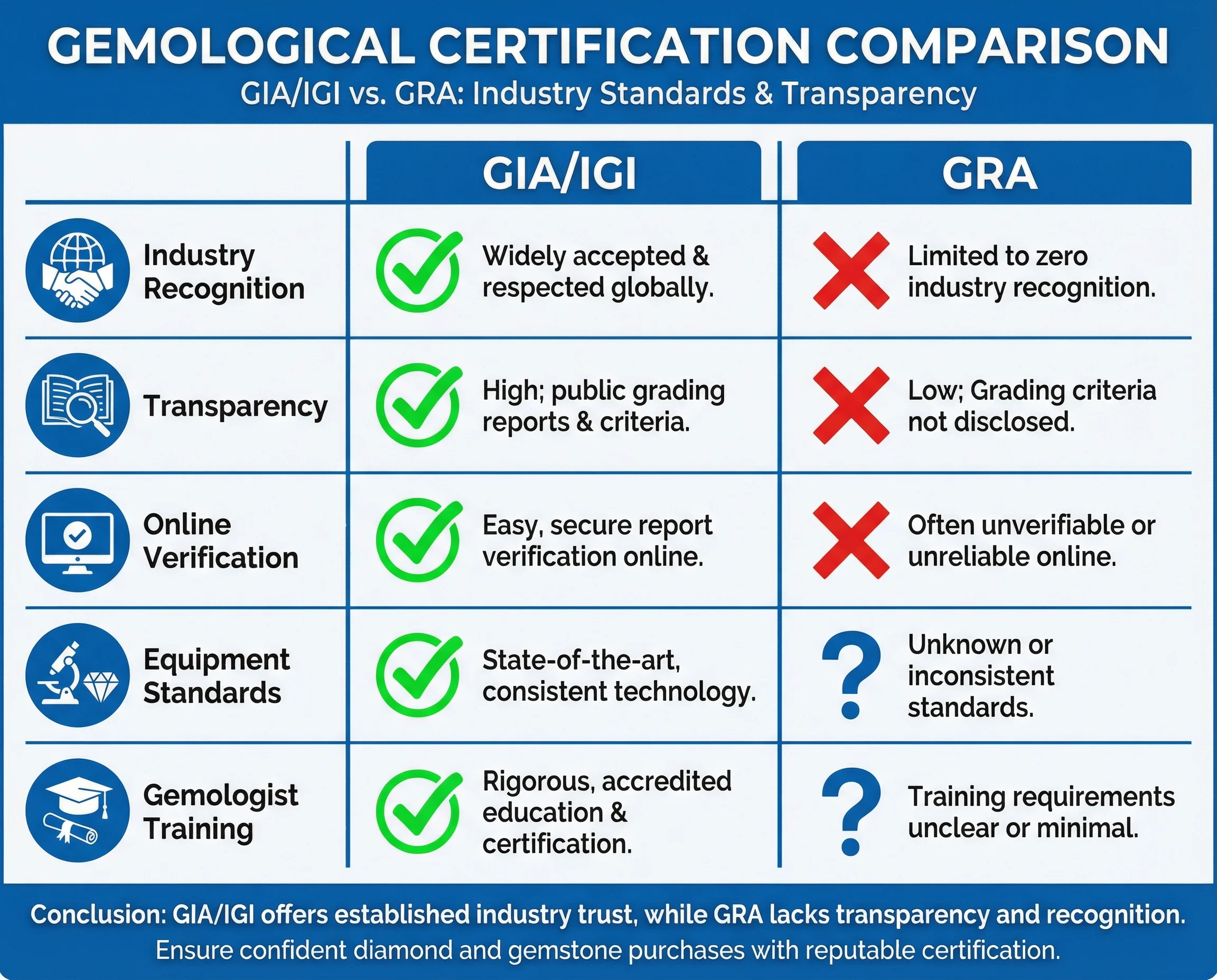 The problem? GRA is not recognized by the gemological industry as an authoritative certification body. Unlike established institutions such as GIA (Gemological Institute of America) or IGI (International Gemological Institute), GRA has no verifiable track record, no transparent grading standards, and no industry accreditation.