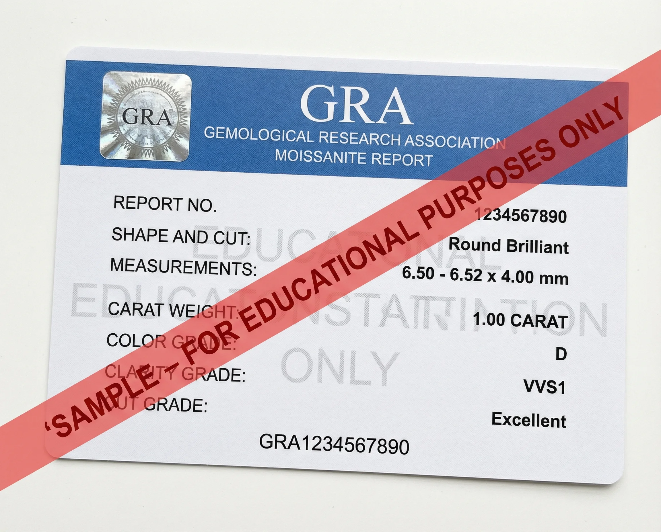 GRA stands for "Gemological Research Association," an organization that issues grading reports for moissanite and other gemstones. On the surface, these certificates appear professional—they include detailed measurements, color grades, clarity assessments, and even security features like holograms.