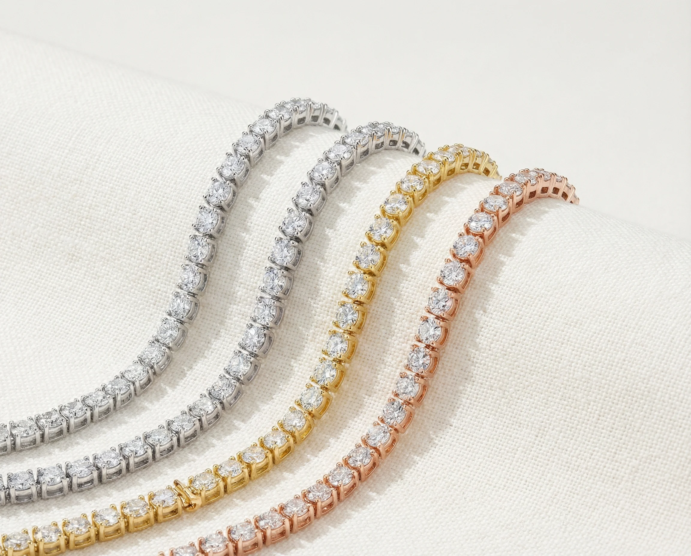 The metal you choose affects both the look and longevity of your tennis bracelet. Here's what to consider: