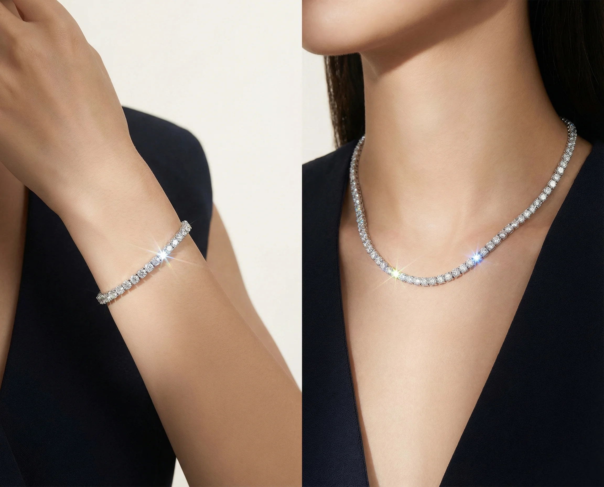 But here's what most people don't realize: moissanite tennis bracelets and chains deliver the same stunning sparkle at a fraction of the cost—often 80-90% less than diamond equivalents.