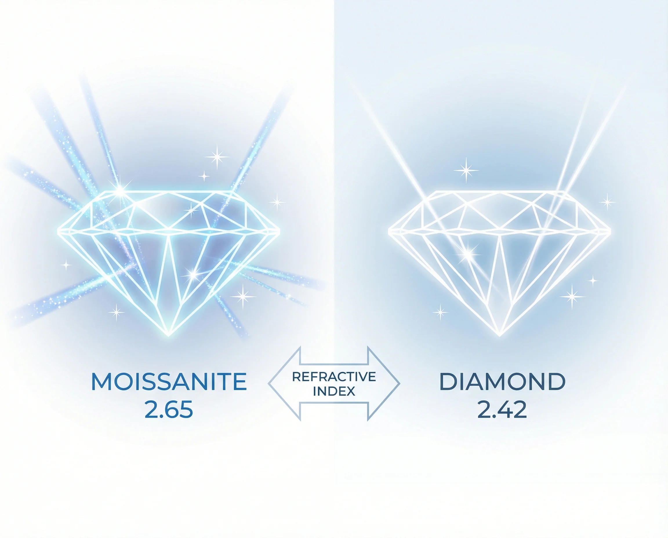 - Refractive Index: Moissanite has a refractive index of 2.65-2.69, compared to diamond's 2.42