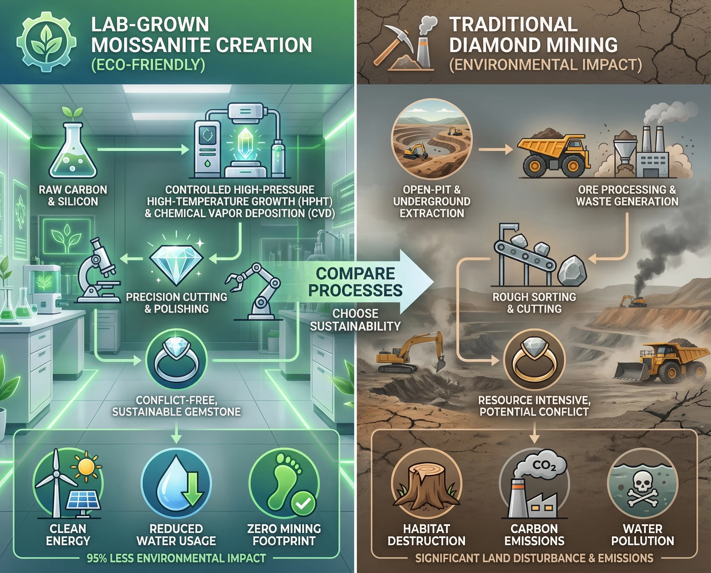 - ✅ Smaller carbon footprint (studies show 80-90% less CO₂ than mined diamonds)