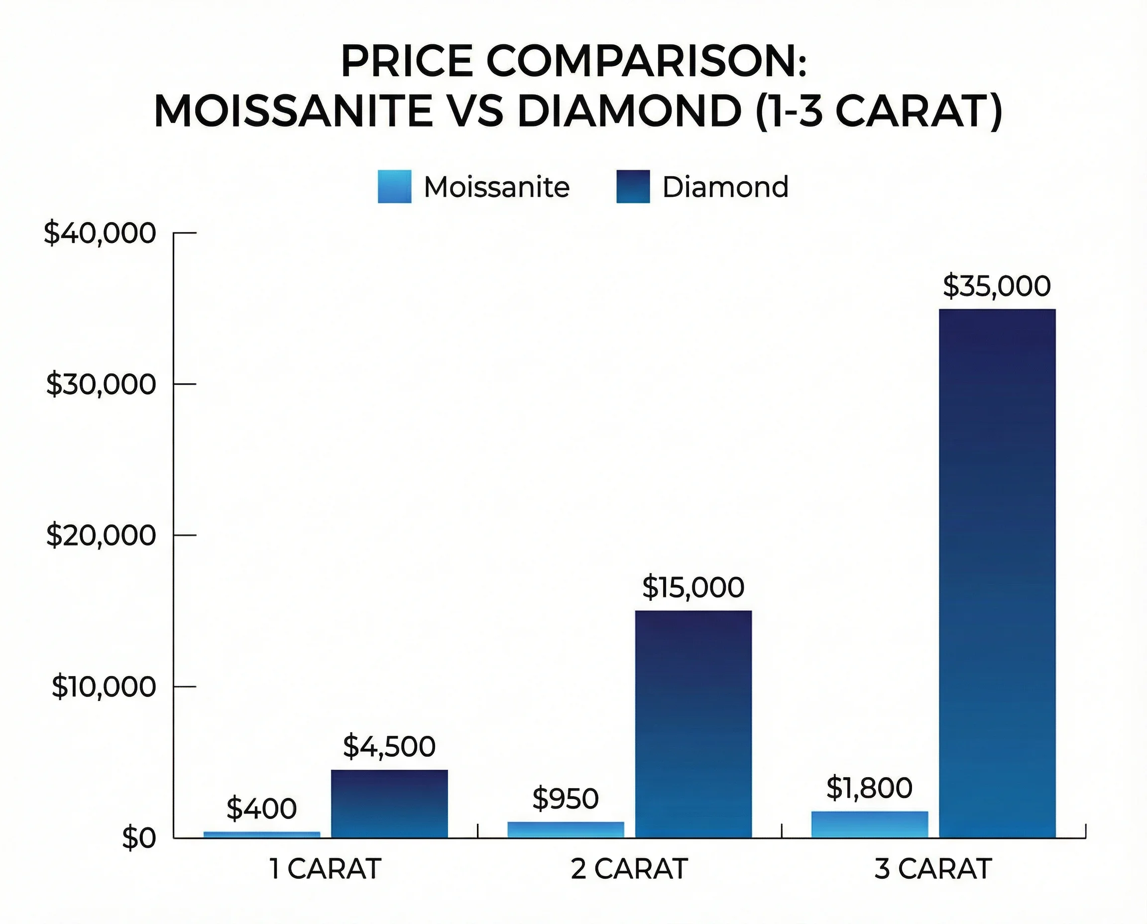 This is where moissanite truly shines. We tracked prices across 20+ retailers over the past year to compile accurate market data. For the same size and quality, moissanite costs 80-90% less than diamond: